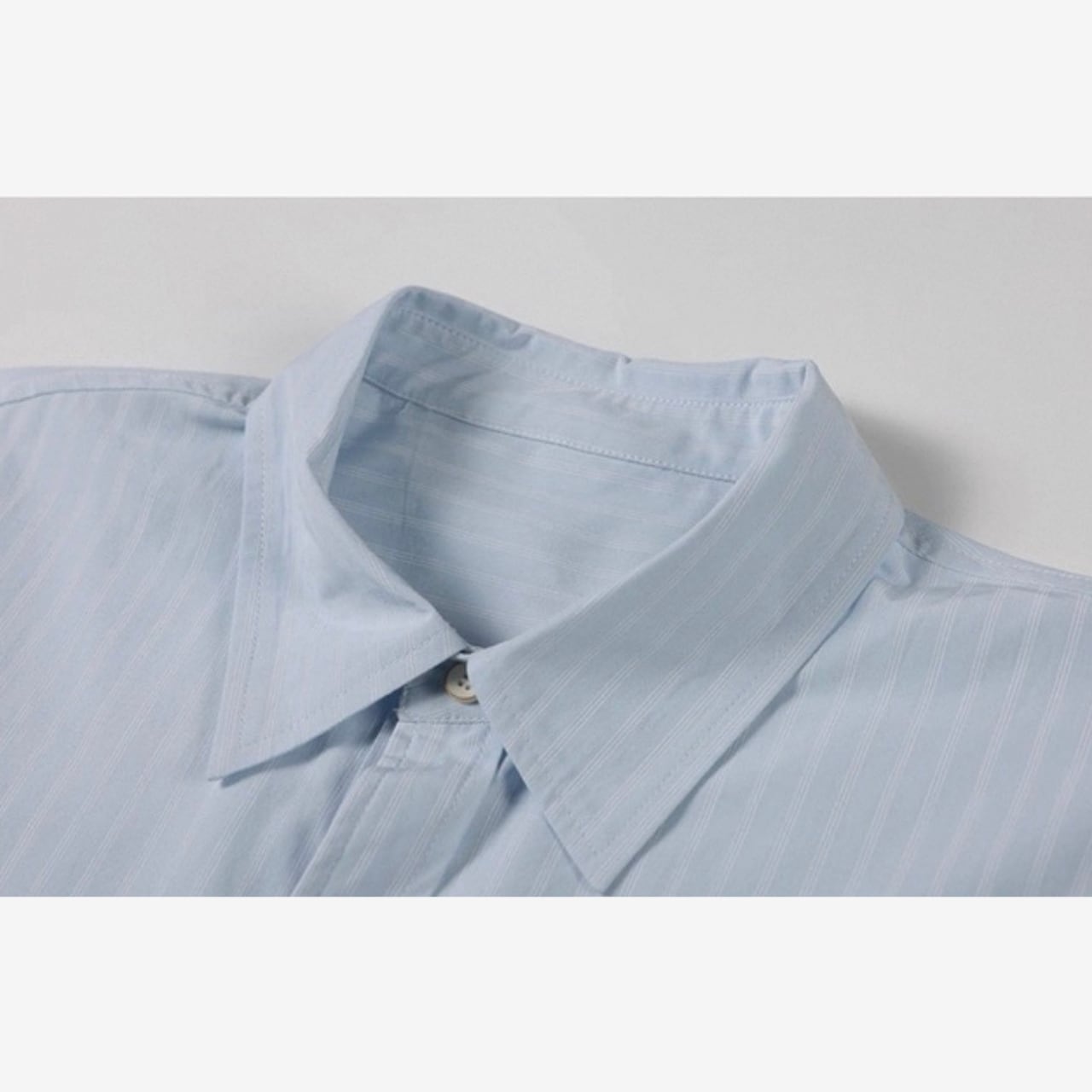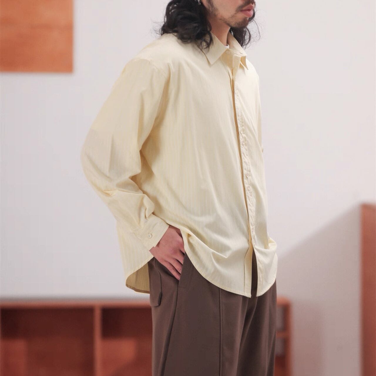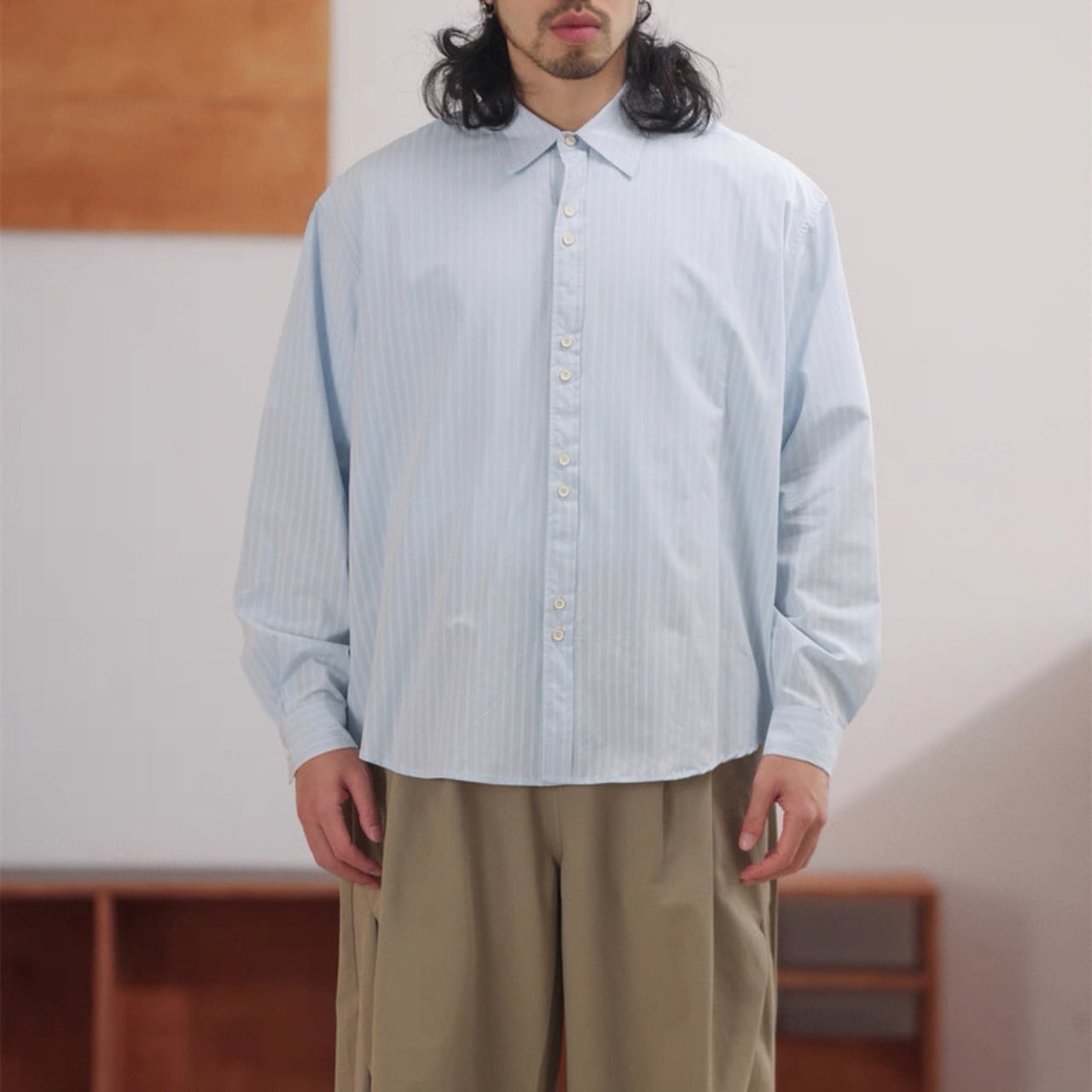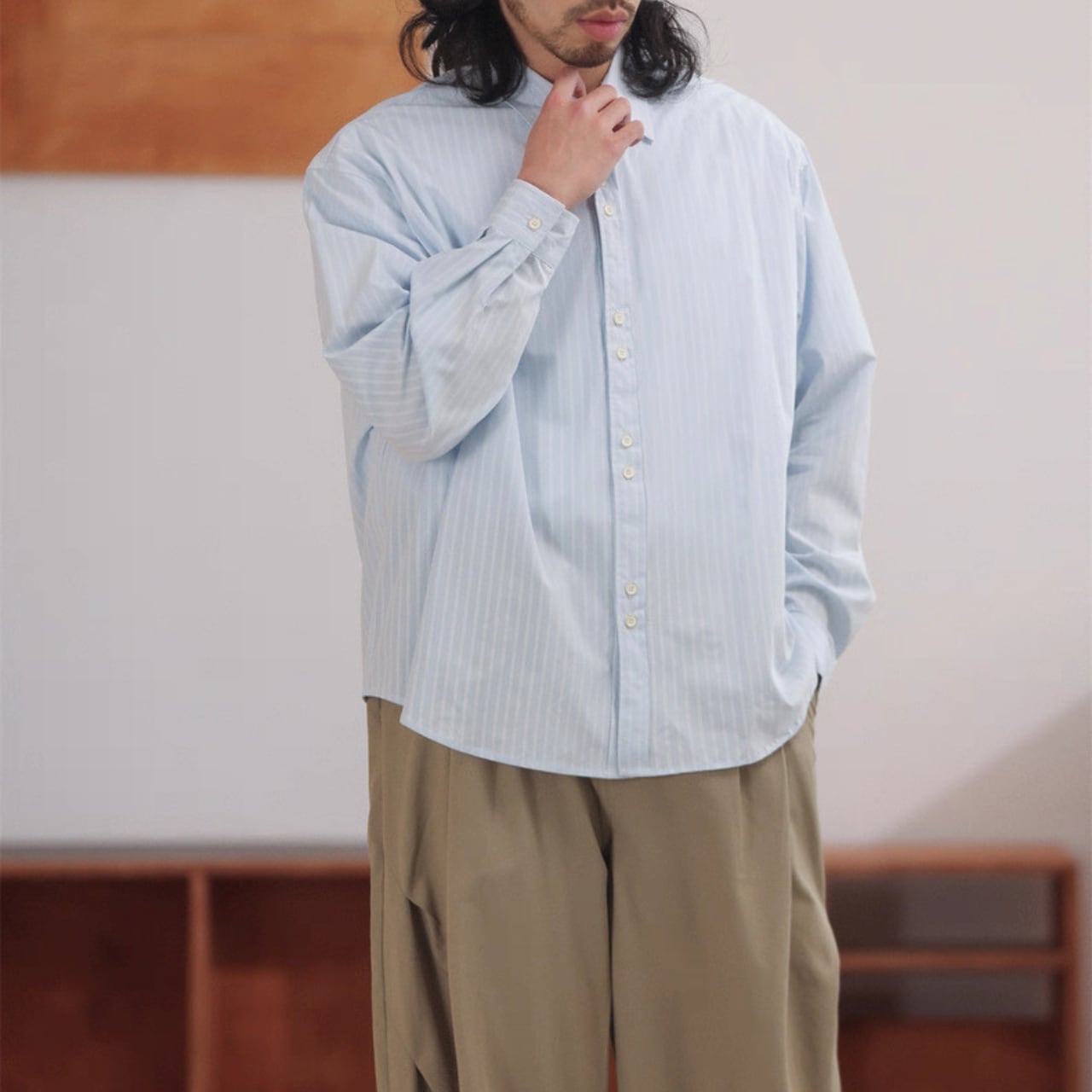 細ストライプ柄がすっきり見えするオーバーシャツ。