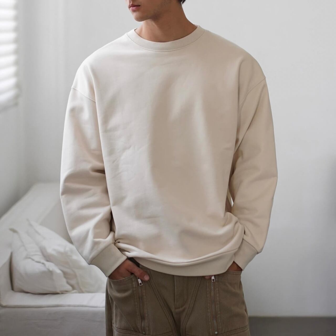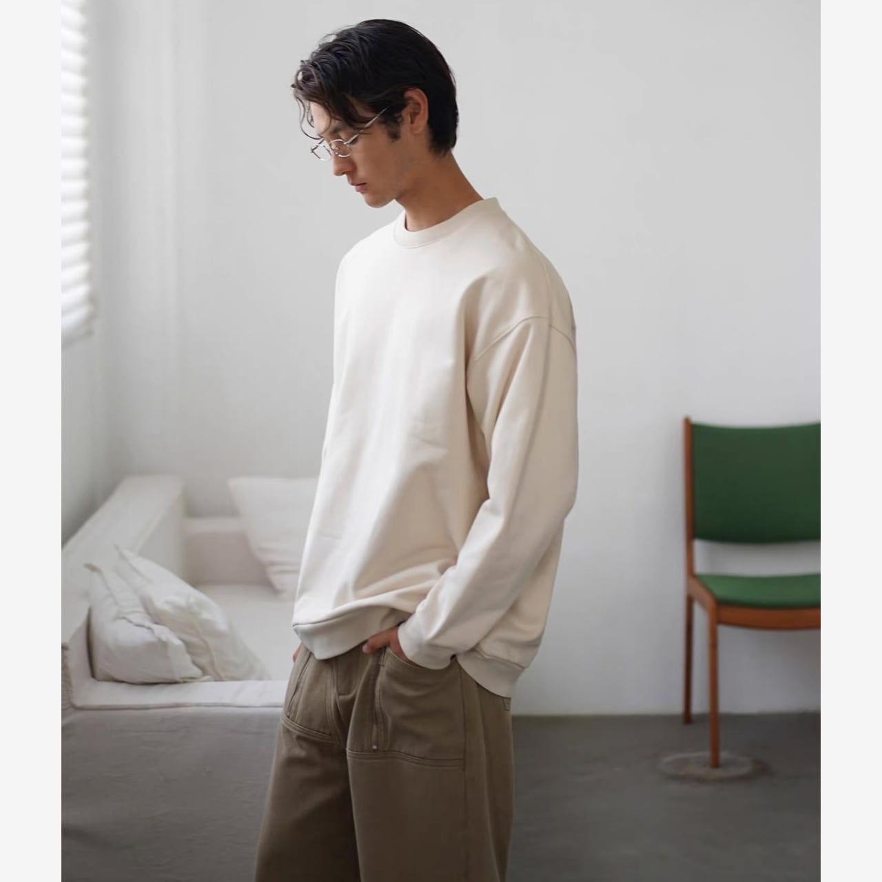 ゆとりのあるシルエットとシンプルなクルーネックがさりげないアクセントに。