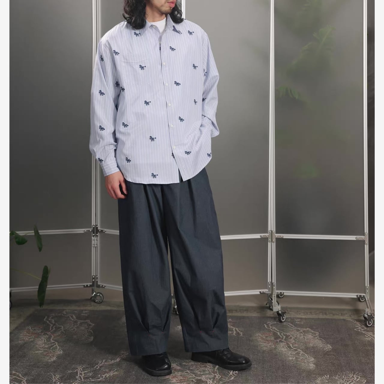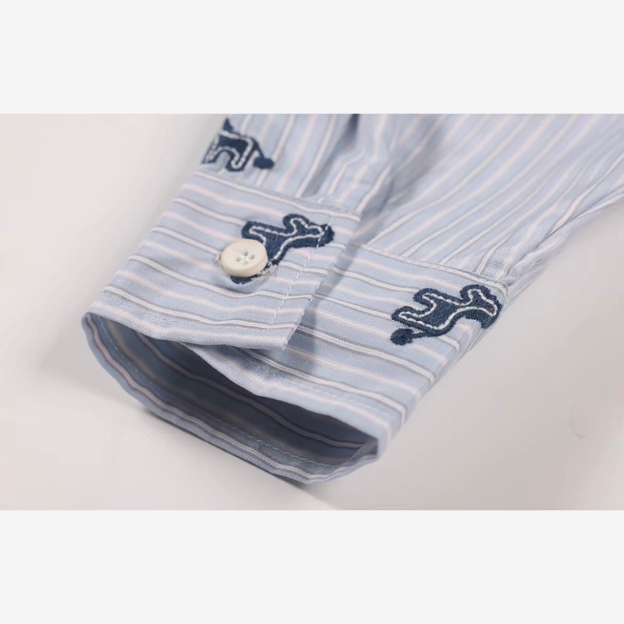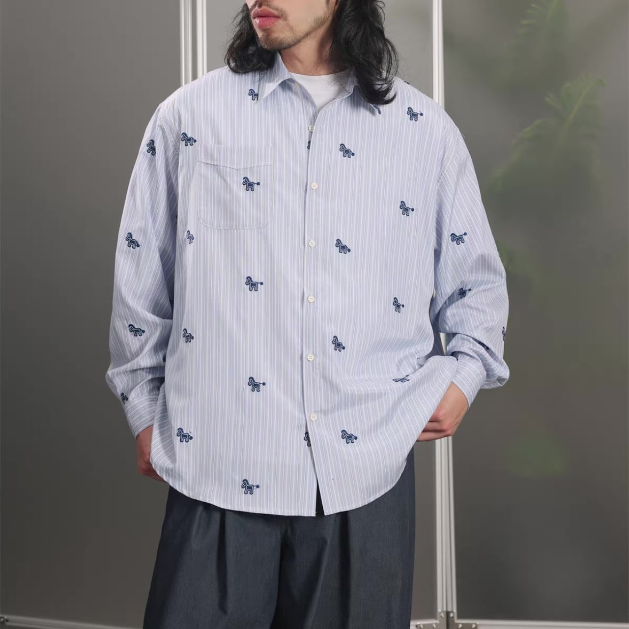 細めのストライプにポニーモチーフを散りばめたデザインのシャツ。
